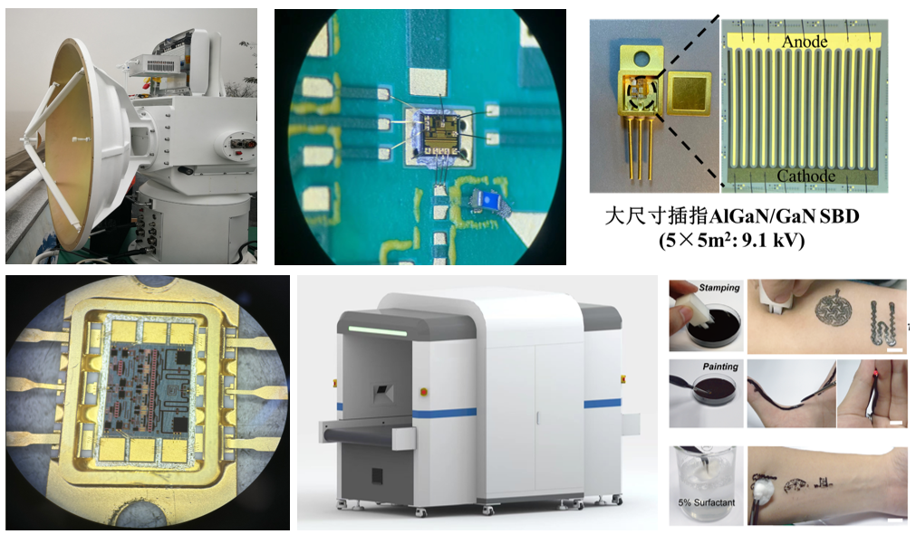 研究团队在射频芯片设计、毫米波雷达、新型电子器件方面取得多项成果。团队研究和开发了射频系列芯片,包括射频前端中低噪声放大器、混频器、开关和功率放大器等,频率涵盖P、L、S、C、X、Ku、Ka、E、D波段;该系列芯片频段覆盖范围宽、带宽大、带内平坦度好、效率高、线性度好,可以应用于气象探测雷达、无线通讯、电子对抗等领域。团队还利用非接触式智能检测与大数据采集自动模拟相结合,通过多部高集成度雷达谱学探测模块,开发了一套面向安检场景使用的毫米波活体检测仪,其检测准确率达90%,目前已在多地海关心境示范性应用。此外,团队还在一系列新型微电子器件领域取得了多项进展:GaN功率肖特基二极管、新型碲基场效应管、表皮直写电子墨水等。