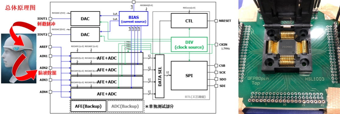 团队通过开展国际合作,为监测脑电信号(EEG)而专门设计的多通道有源电极专用集成电路(ASIC)芯片,可以实现对信号精准捕捉,并实时执行模数转换。该芯片还具备SoC的简易信号处理和标准接口功能(图1)。由于脑电信号非常敏感且易受噪声干扰,同时需要长时间监测,因此该芯片包括创新设计的高分辨率、高信噪比的逐次比较(SAR)复合型模数转换器,以保证信号完整性。此外,采用带有翻转电压跟随器(FVF)的跨导跨阻抗(TCTI)斩波(chopping)放大器和减少漏电流的版图设计技术,显著降低了系统功耗。基于有源电极的脑电信号采集系统,可以为开发应用前景广阔且具市场价值的可穿戴产品提供核心技术支持。