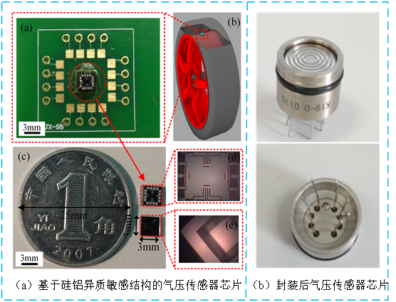 此外,在国家自然科学基金项目支持下,本中心团队与中电五十五所、中科院苏州纳米所等单位联合研发了基于硅铝异质敏感结构的MEMS差分压力传感器及系统(图3),具备以下性能:①灵敏度:0.283 mV/(V·kPa);②热偏移系数(TCO):-1.51×10⁻³%FS/°C;③测量误差<±0.1%FS。该压力传感器芯片适用于高精度气象观测及汽车胎压监测系统等领域。