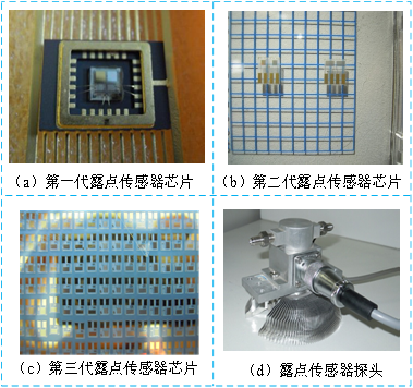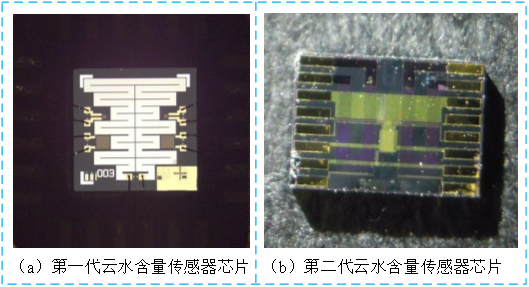 本中心在科技部行业专项重点项目、国家自然科学基金等项目资助下,成功研制了应用于气象探测的露点传感器、云水含量传感器、气压传感器等核心MEMS芯片,并研制了配套的接口电路与测控系统。其中,MEMS露点传感器芯片(图3.1)具备以下核心技术优势:①采用TiW/Au/SiO₂/SiN/SiC组成的无机薄膜器件结构,实现对水分子凝结的高灵敏度检测;②采用蓝宝石衬底制造工艺,显著降低衬底噪声、提升器件稳定性;③材料具备优异的耐腐蚀、耐高低温和抗辐射性能,适用于复杂气象环境。
