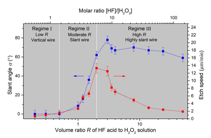 本研究针对低掺杂p型(100)硅片,系统探究了氢氟酸(HF)与双氧水(H₂O₂)体积比对MACE过程中纳米线形貌的调控规律。研究团队发现,通过调节HF酸与H₂O₂溶液的体积比,可在室温下实现从垂直纳米线到高角度倾斜纳米线的连续可控制备,倾斜角度范围广泛且无明显晶体学择优取向。实验表明,倾斜纳米线的形成与刻蚀过程中金网格的倾斜运动直接相关,而该运动很可能由氢气气泡诱导的流体动力效应所驱动。