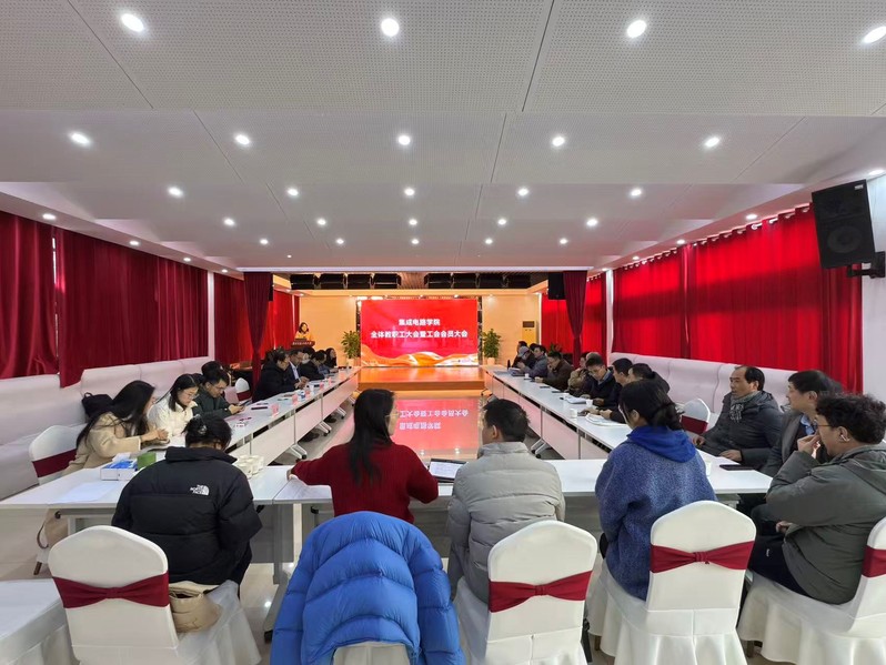2026年1月9日上午,集成电路学院全体教职工大会暨工会会员大会在教职工活动中心多功能厅成功举办。学院领导班子成员与全体教职工齐聚一堂,回顾过往征程,共话未来发展。会议由院党委书记唐敏主持。
