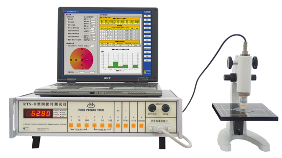 RTS-8 型四探针测试仪:是运用四探针测量原理的多用途综合测量设备。该仪器按照单晶硅物理测试方法国家标准并参考美国A.S.T.M 标准而设计的,专用于测试半导体材料电阻率及方块电阻(薄层电阻)的专用仪器。测量数据既可由主机直接显示,亦可由计算机控制测试采集测试数据到计算机中加以分析,然后以表格、图形方式统计分析显示测试结果。