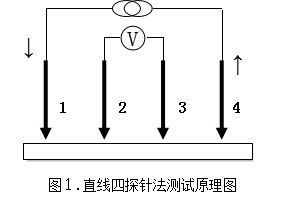 将四根排成一条直线的探针以一定的压力垂直地压在被测样品表面上,在1、4 探针间通以电流 I(mA),2、3 探针间就产生一定的电压 V(mV)(如图1)。测量此电压并根据测量方式和样品的尺寸不同,可分别按公式计算样品的电阻率、方块电阻、电阻。