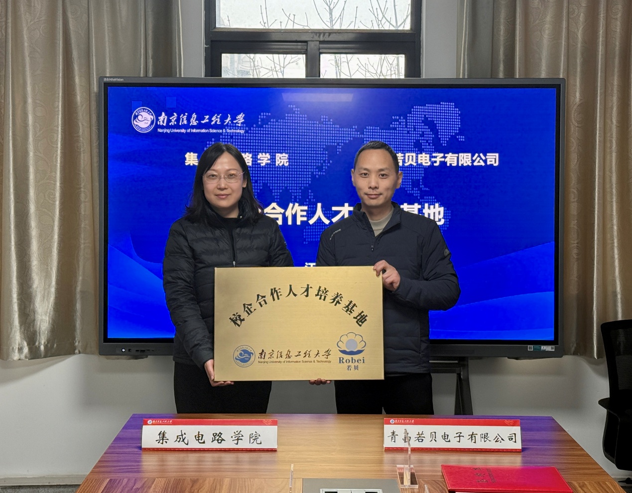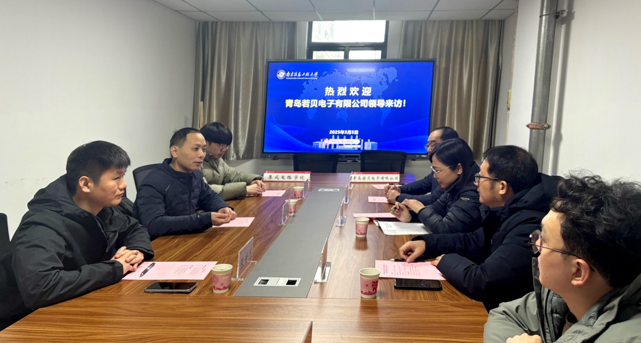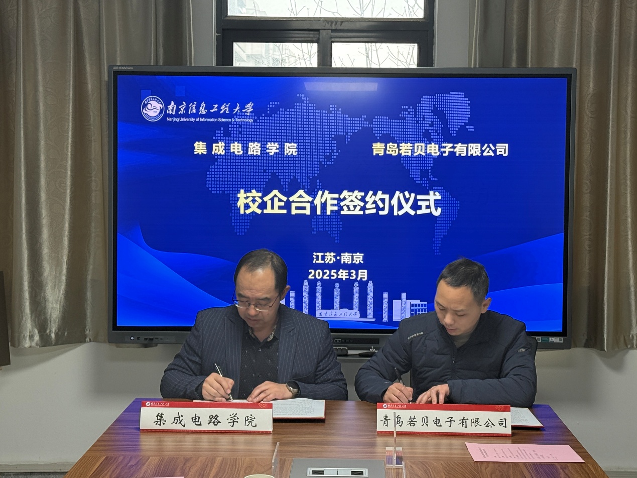 3月5日下午,南京信息工程大学(以下简称“南信大”)集成电路学院与青岛若贝电子有限公司(以下简称“若贝”)在南信大学科楼签署校企合作协议并就共建“校企合作人才培养基地”举行揭牌仪式。集成电路学院书记唐敏、副书记(副院长)王康宏、院长助理张加宏、实验中心主任冒晓莉和创新创业教学中心副主任陶治,若贝的董事长吴国盛、市场总监张世杰、技术部主管邵青超一同出席了此次签约揭牌仪式。