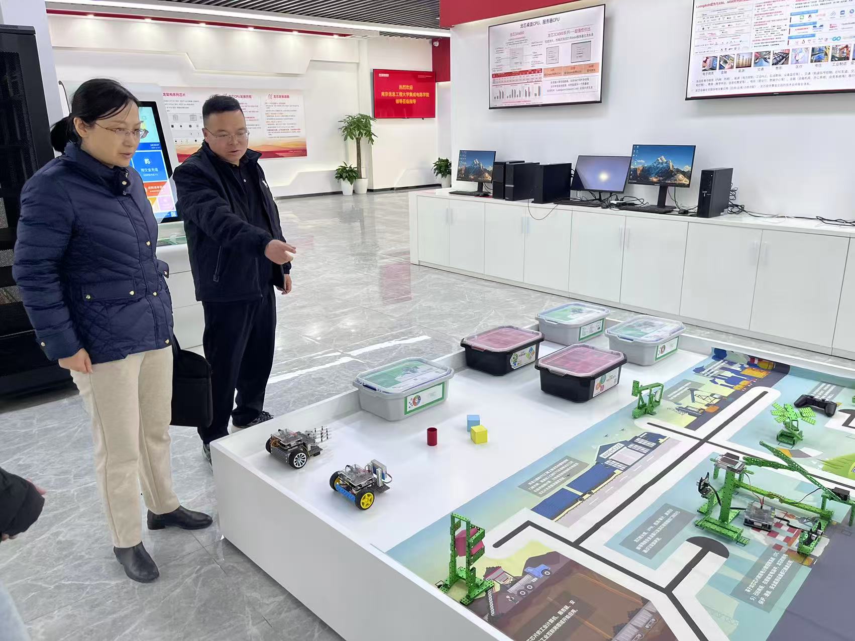 展厅内,基于龙芯架构的实验开发板、嵌入式智能设备、教学实训套件等实物展示区,引发了老师们的重点关注:张加宏副院长拿起一款LoongArch生态实验箱,询问其在高校实验教学中的适配场景;陶冶老师则围绕设备的实操性与企业技术工程师张曦交流,探讨如何将其融入集成电路设计课程的实践环节。唐敏书记在参观后表示:“龙芯的自主技术成果,既为我们的教学提供了‘真场景’,也为学生接触产业前沿搭建了‘零距离’平台。”