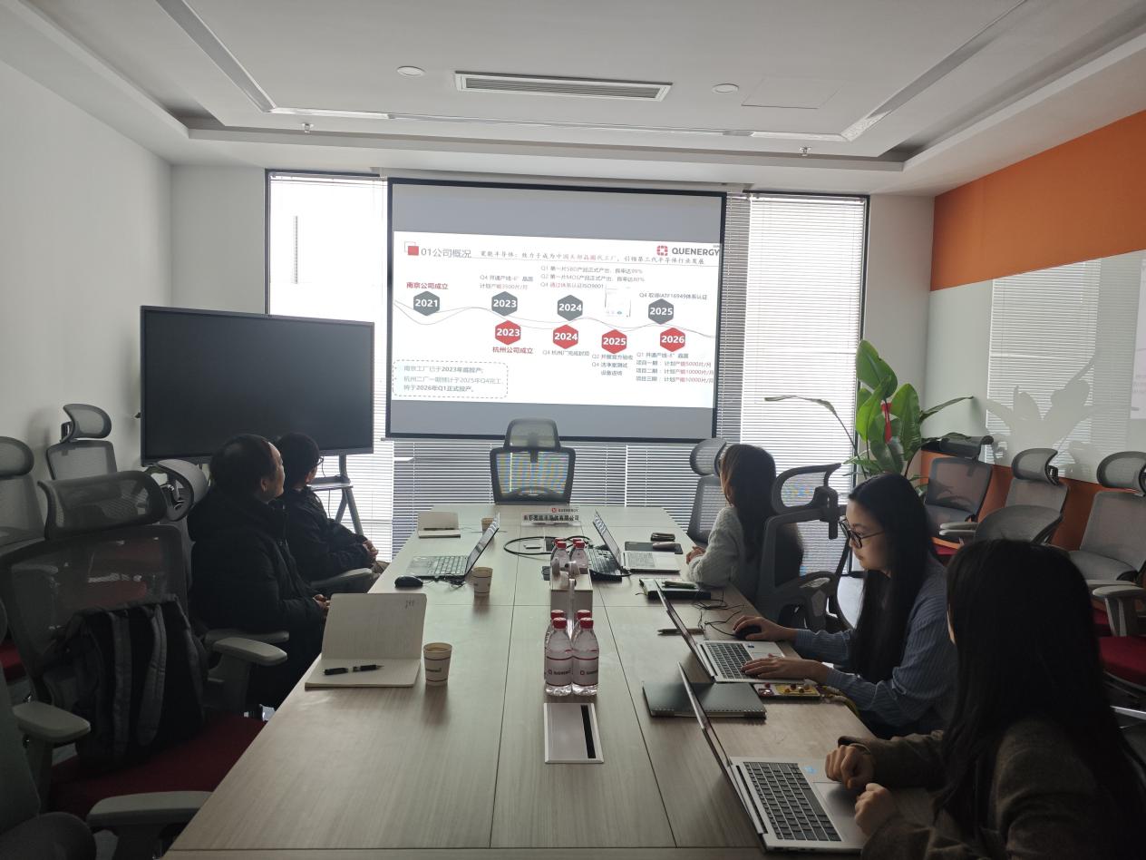 在南京宽能半导体有限公司会议室,周经理对学院的来访表示欢迎,并介绍了公司的发展概况、主要产品和技术优势。同时就双方在公司新技术开发、人才培养、成立联合实验室等方面进行了探讨。
